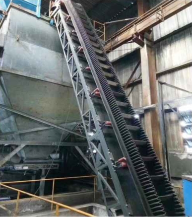 DJ型大倾角皮带输送机其结构是在平形橡胶运输带两侧有自由伸缩的橡胶波形立式,在裙边之间又粘有一定强度和弹性的横隔板组成匣形斗,使物料在斗中进行“裙边"连续输送。